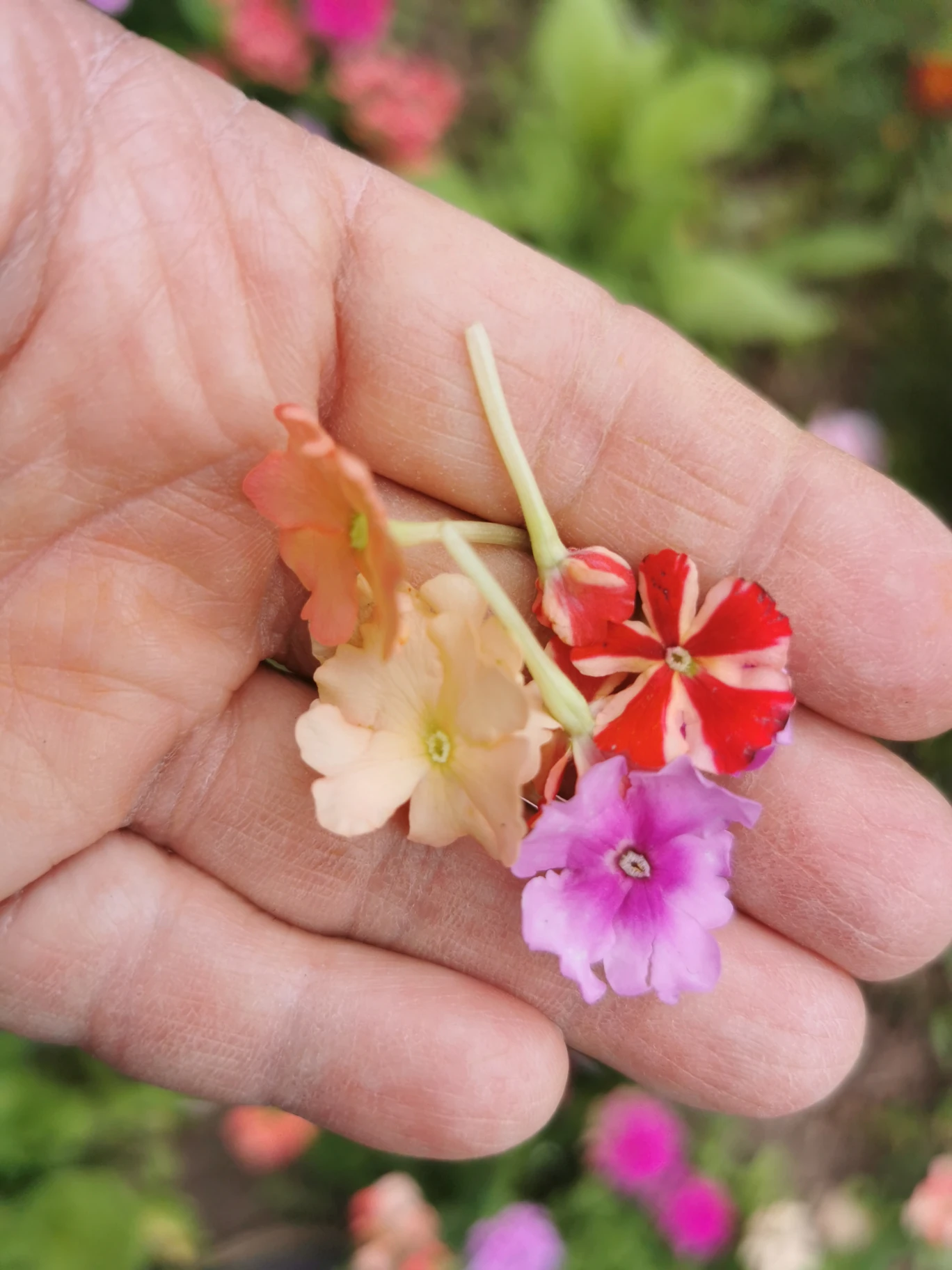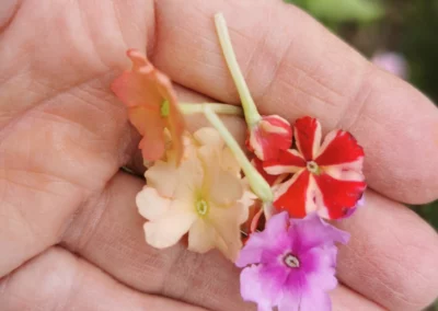 Agastache, Bleuet, Bourrache, Capucine, Tagète, Bégonia, Verveine, Pensée, Violette, Rose, Hémérocalle, Alstroméria, Pois, Basilic, Tulbaghia, Julienne des Dames, Cosmos, Mauve, Monarde, Œillet, Souci, Dalhia, etc.